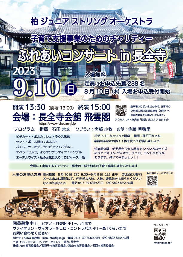 9月10日(日) ふれあいコンサート in 長全寺 by 『柏ジュニア ストリング オーケストラ』 2023年8月1日 最終更新日時 : 2023年8月1日 kazakita-furu 子育て支援事業のためのチャリティコンサートです。入場無料、ぜひご参加を!!