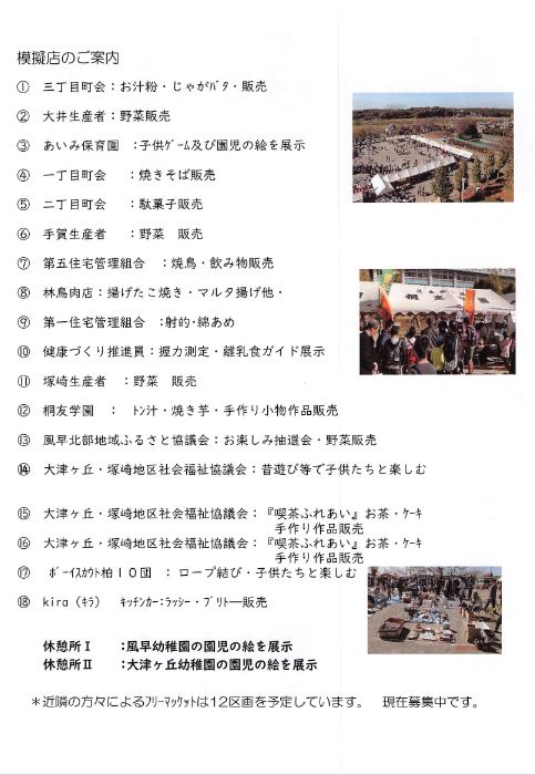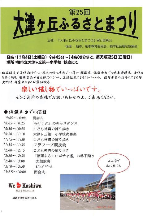 『第25回大津ヶ丘ふるさとまつり』開催します! 2023年10月13日 最終更新日時 : 2023年10月13日 kazakita-furu 《11月4日(土) 9:45~14:00 柏市立大津ヶ丘第一小学校校庭》楽しい催し物がいっぱいです。ご近所の皆さまでお誘いあわせの上、ご来場ください。