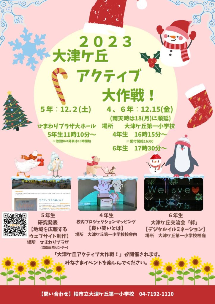 大津ヶ丘第一小学校『大津ヶ丘アクティブ大作戦!』 2023年11月30日 最終更新日時 : 2023年11月30日 kazakita-furu 12/2 ひまわりプラザ、12/15 大津ヶ丘第一小学校で開催。ぜひ、ご参加をお願いします。