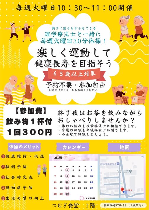 楽しく運動して、健康長寿を目指そう!(65歳以上対象) 2024年4月8日 最終更新日時 : 2024年4月8日 kazakita-furu 理学療法士と一緒に 毎週火曜日30分体操 《予約不要・参加自由》